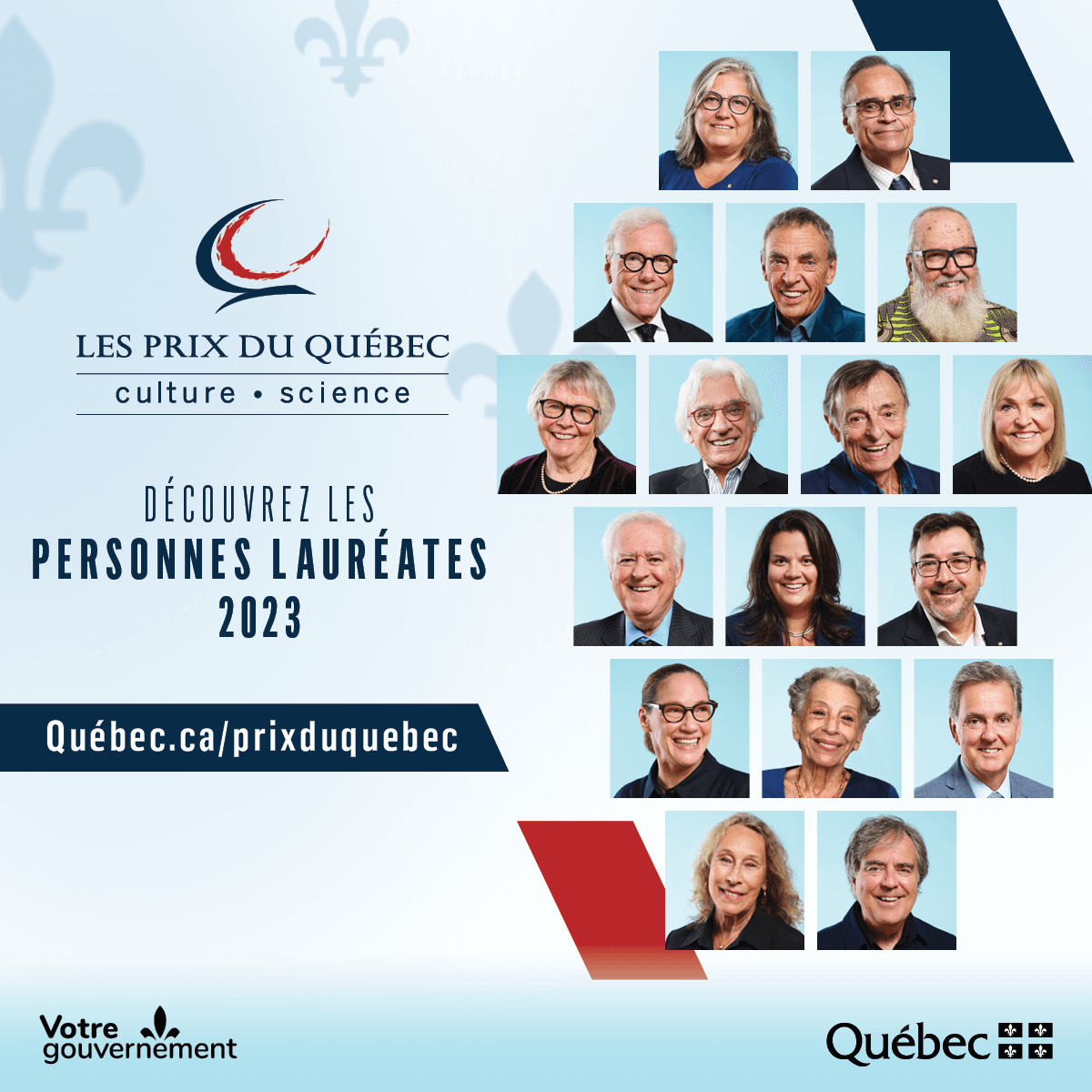 Le ministre de l’Économie, de l’Innovation et de l’Énergie, ministre responsable du Développement économique régional et ministre responsable de la Métropole et de la région de Montréal, M. Pierre Fitzgibbon, et le ministre de la Culture et des Communications, ministre responsable de la Jeunesse et ministre responsable de la région de l’Outaouais, M. Mathieu Lacombe, ont dévoilé aujourd’hui les noms des 17 lauréates et lauréats des Prix du Québec 2023 dont la cérémonie de remise aura lieu le 22 novembre prochain à Québec.
