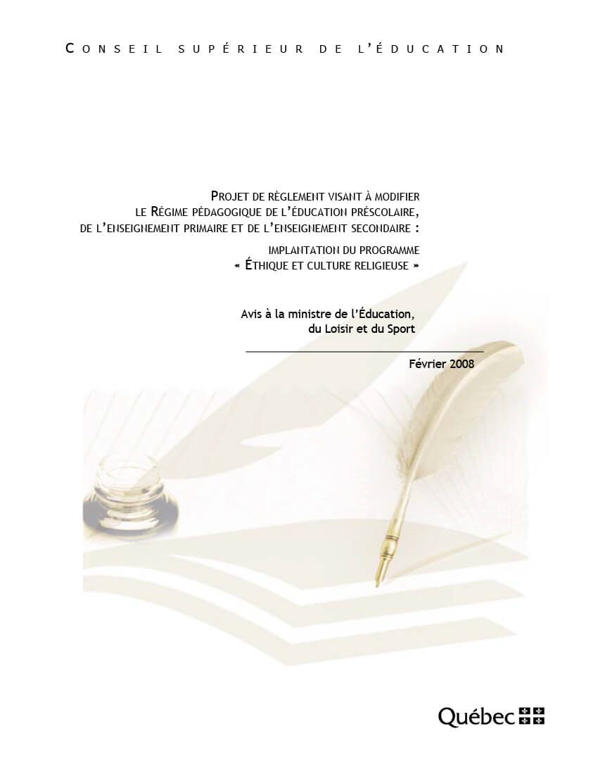 Le Conseil supérieur de l’éducation (CSE) est favorable à l’implantation de la matière obligatoire « éthique et culture religieuse » en remplacement de la matière obligatoire « enseignement moral » ou « enseignement moral et religieux (catholique ou protestant) ». Le remplacement est effectif à compter de septembre 2008 au primaire et au secondaire. C’est ce qui ressort de cet avis réalisé par le CSE et transmis à la ministre de l’Éducation, du Loisir et du Sport en conformité avec la Loi sur le Conseil supérieur de l’éducation.